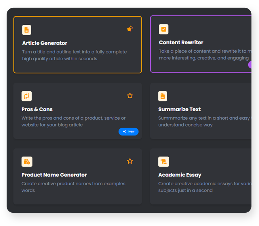 Browse through our wide selection of AI-powered tools designed to help you create blog posts, product descriptions, ad copy, website content, emails, and more.